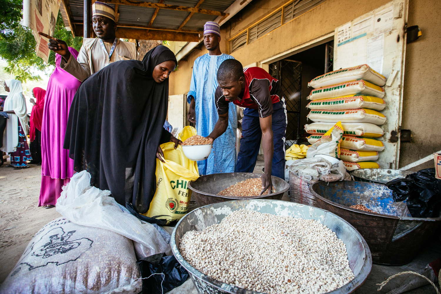 The dust whirls in the early morning air on the streets of Maiduguri, capital of Nigeria’s Borno State. Yellow kekes – tricycles – rush down the main road, zig-zagging between old trucks transporting vast quantities of wood, bricks, or people in their trailers. Off the main road is an alley, lined with shops, where vendors wait for shoppers to arrive.