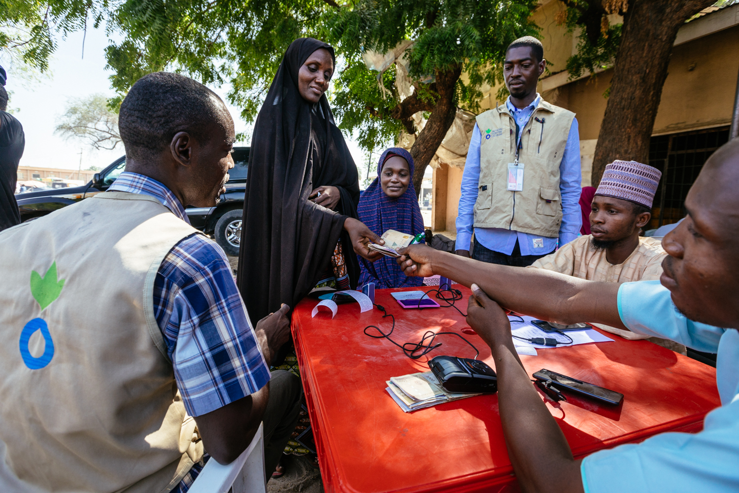 At the market, Kolom hands over an electronic card to a cash vendor and a food vendor selling yams. She is identified through a biometric fingerprint reader that connects to a mobile application, which shows the group’s account balance and transaction history. The monthly amount is divided between cash for water, firewood, and transportation costs and electronic vouchers to buy food. Kolom receives 6,500 naira in cash for the non-food items and then uses the card to buy yams.