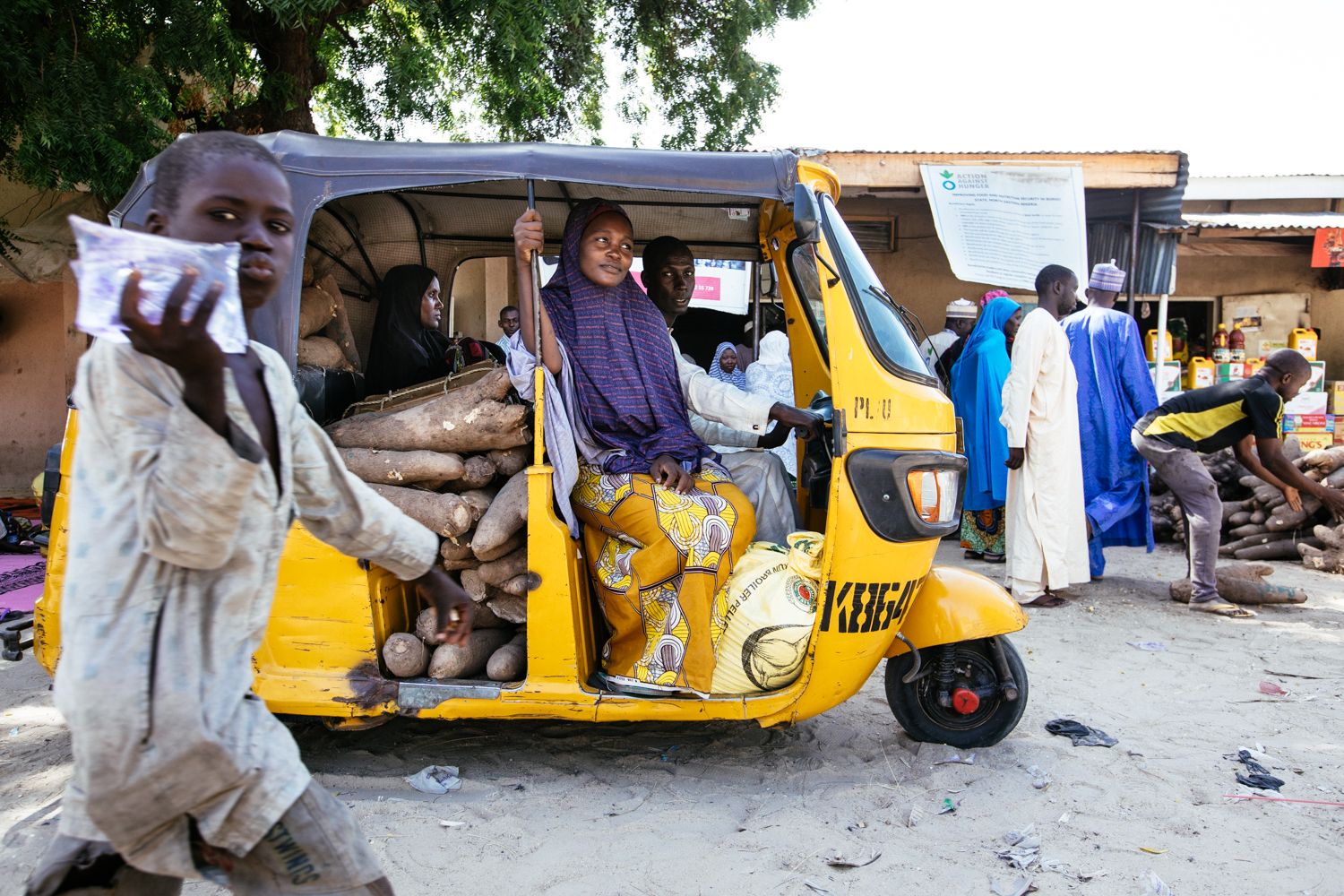 The dust whirls in the early morning air on the streets of Maiduguri, capital of Nigeria’s Borno State. Yellow kekes – tricycles – rush down the main road, zig-zagging between old trucks transporting vast quantities of wood, bricks, or people in their trailers. Off the main road is an alley, lined with shops, where vendors wait for shoppers to arrive.