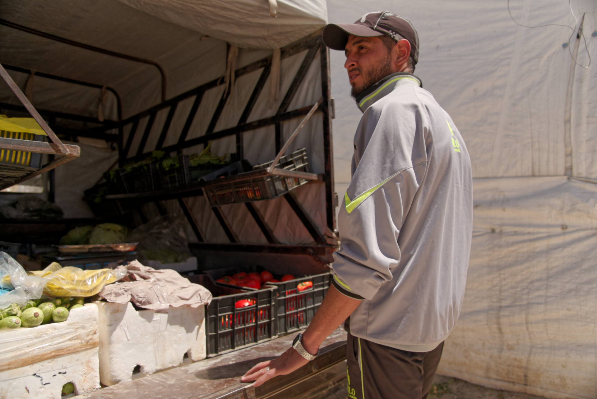 Nasser looked for jobs for a very long time, and ultimately decided to use the little resources he had left to buy a small truck to sell vegetables and ever since, he has been driving around refugee camps to sell produce. A few times a week, he buys his products in the city. His truck’s loudspeakers play a recorded message advertising all vegetable prices and available products. He returns late at night after he earns enough to buy new products to sell.